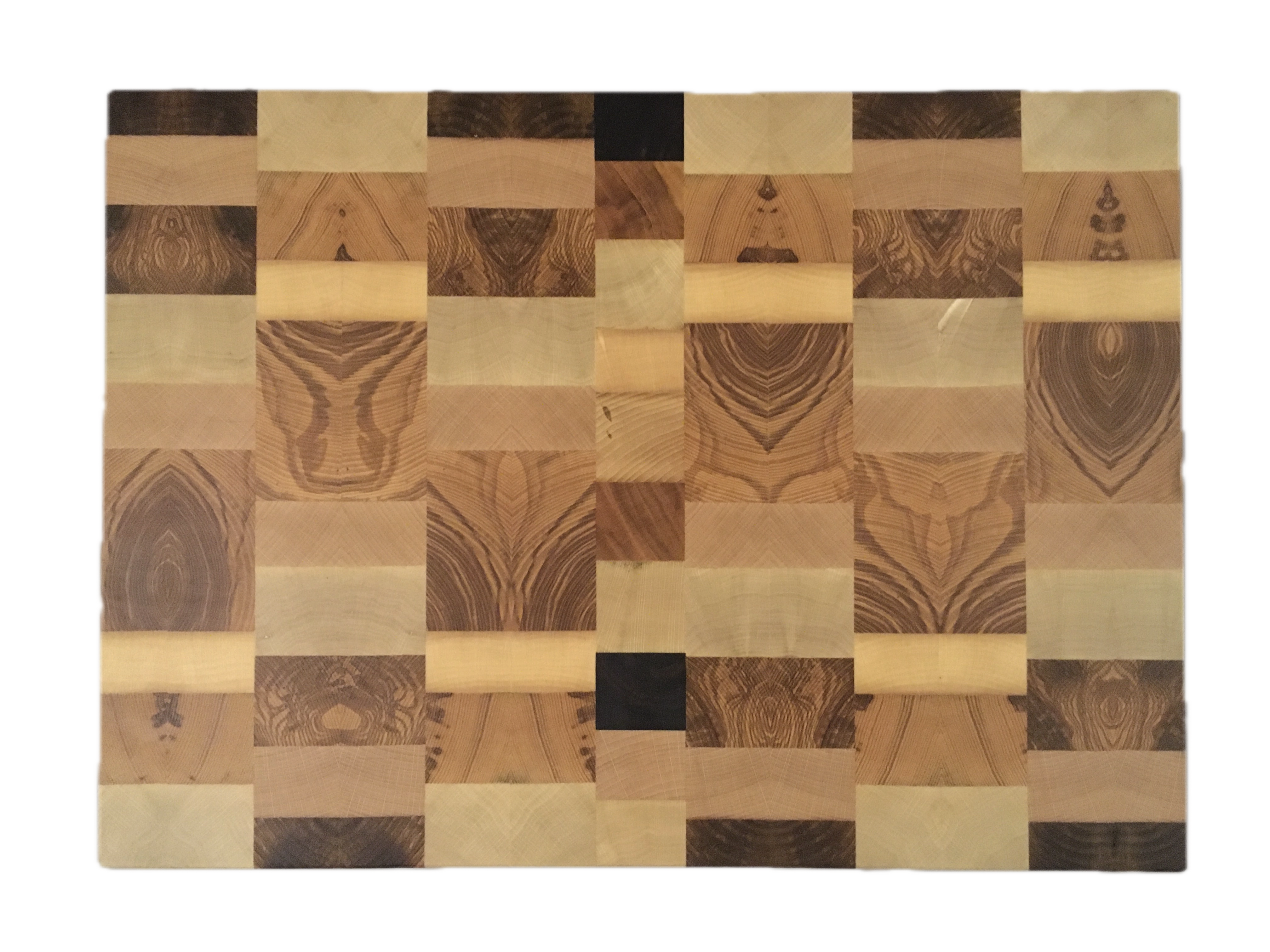 Planche à découper artisanale en bois de bout, façonnée à la main en Alsace. Assemblage de 5 essences locales (hêtre, frêne, charme, cerisier, noyer noir), finitions naturelles à base d’huiles bio et cire d’abeille. Dimensions 43,5 × 31,5 × 3,8 cm – environ 3,8 kg. Après votre commande, ne prenez pas peur… je vous appelle !