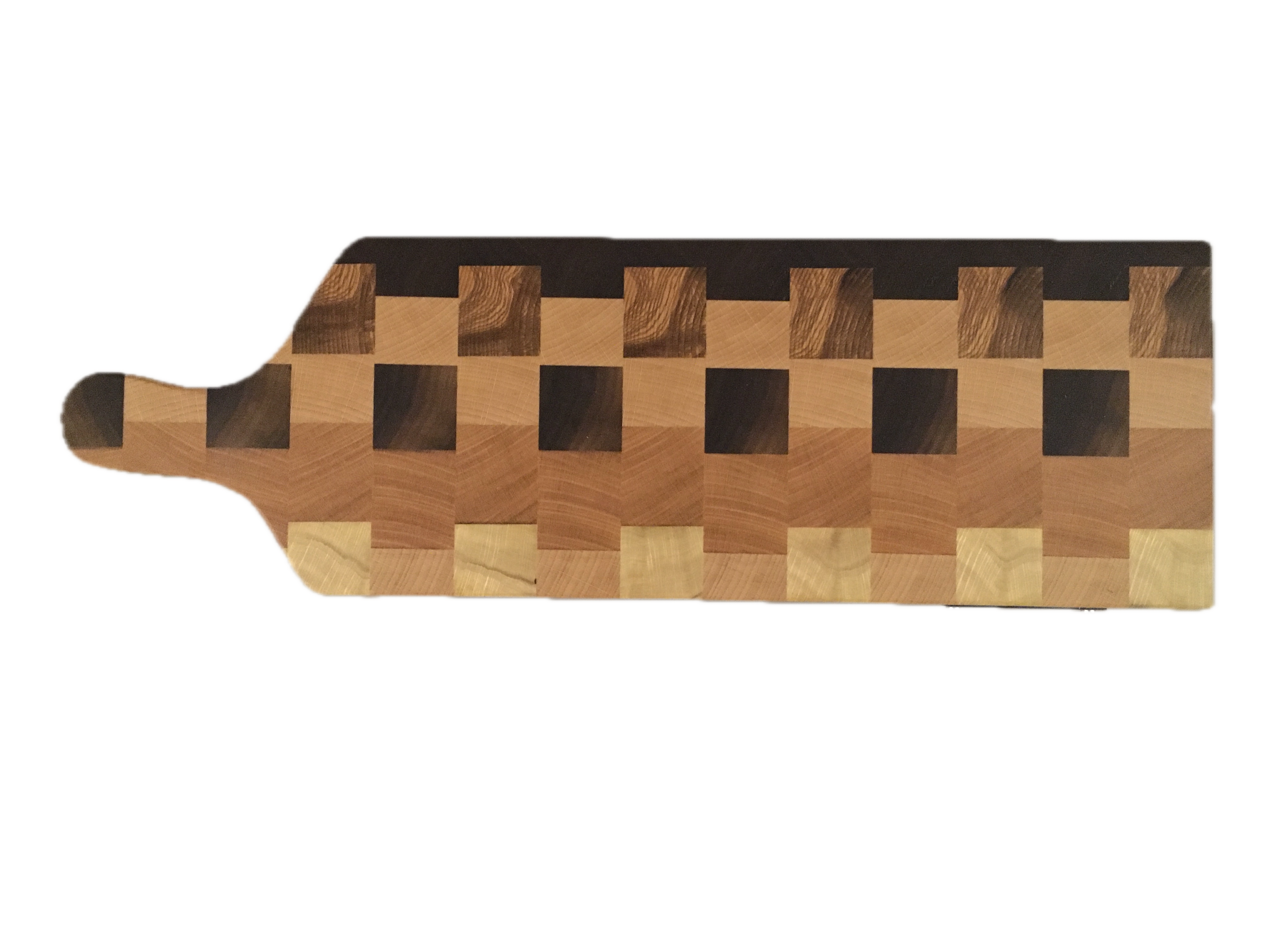 Planchette à découper artisanale en bois de bout, réalisée à la main en Alsace. Assemblage harmonieux de 5 essences locales, hêtre, frêne, charme, cerisier et noyer noir. Finitions naturelles à base d’huiles végétales bio et de cire d’abeille. Dimensions 44 × 14 × 3 cm – environ 1 kg. Poignée intégrée pour une manipulation confortable et sécurisée. Après votre commande, ne prenez pas peur… je vous appelle !
